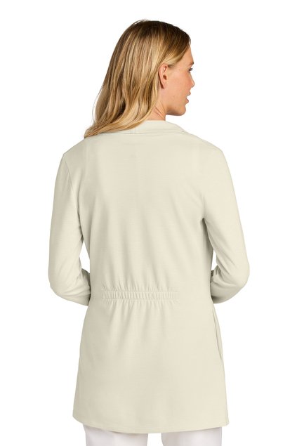 Open front | Shawl collar with waterfall lapels | Set-in sleeves | Side seam pockets | Elastic at back waist for subtle shaping | Self-turned cuffs and hem